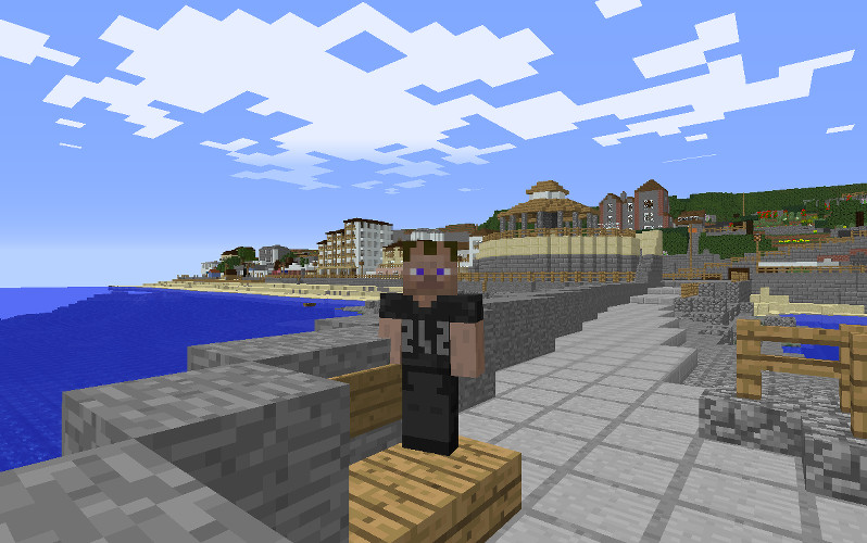 The whole model of Ventnor seafront was build (almost all by my) on our minecraft server Agnomen. This is a "survival" server hosted at the University of Southampton. Building this is survival mode means that I had to mine the stone & sand, chop down the trees, and remove a very large mountain where the Spyglass needed to go. It also means there were nighttime zombie attacks and occasional reparis required due to creeper damage. Why did I do it like this? Because I was having fun.